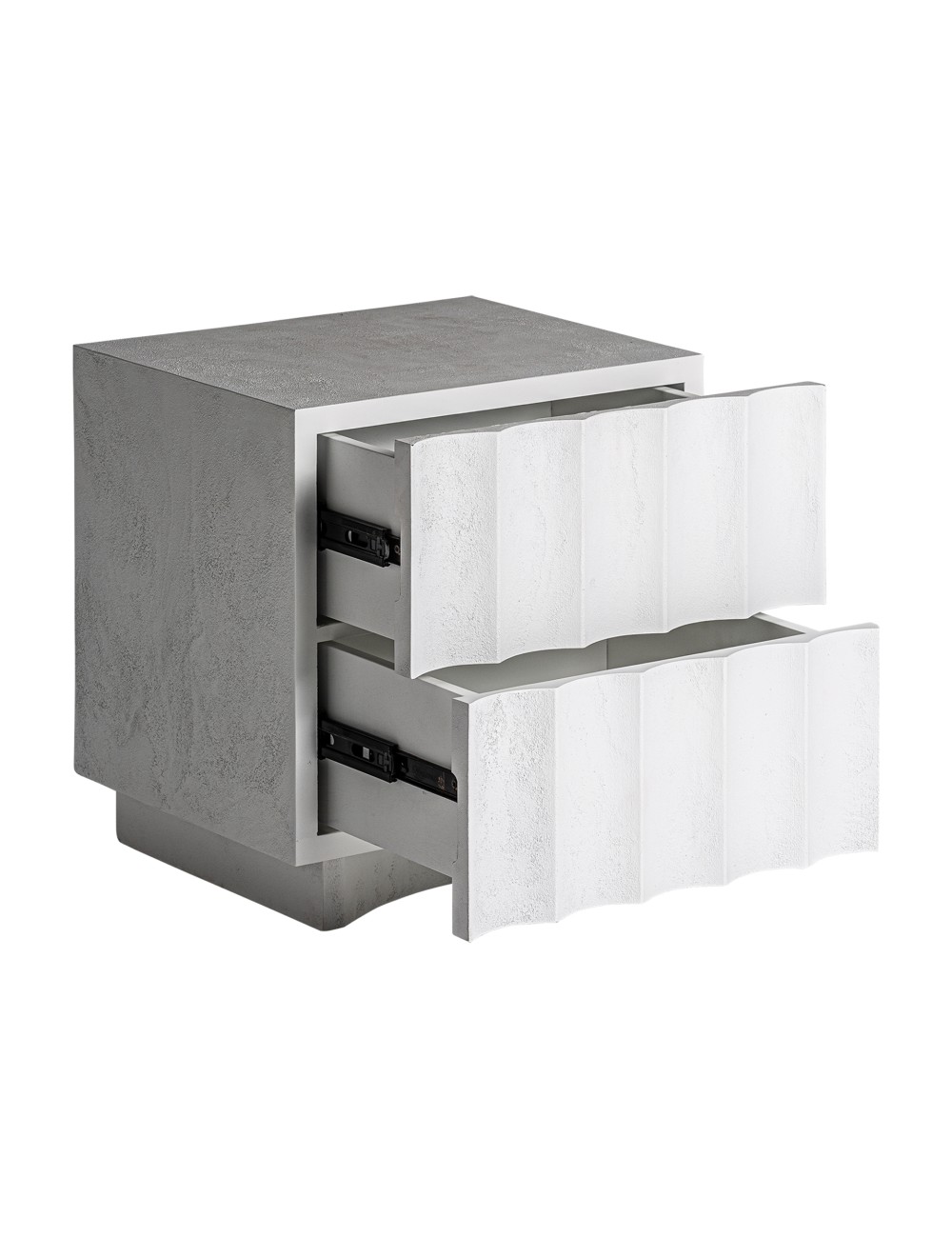Mesita de noche mulcey, en color blanco desgastado, de estilo contemporáneo. Fabricado en resina, combinado con madera dm.