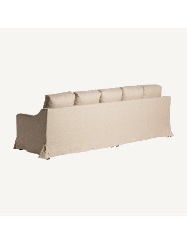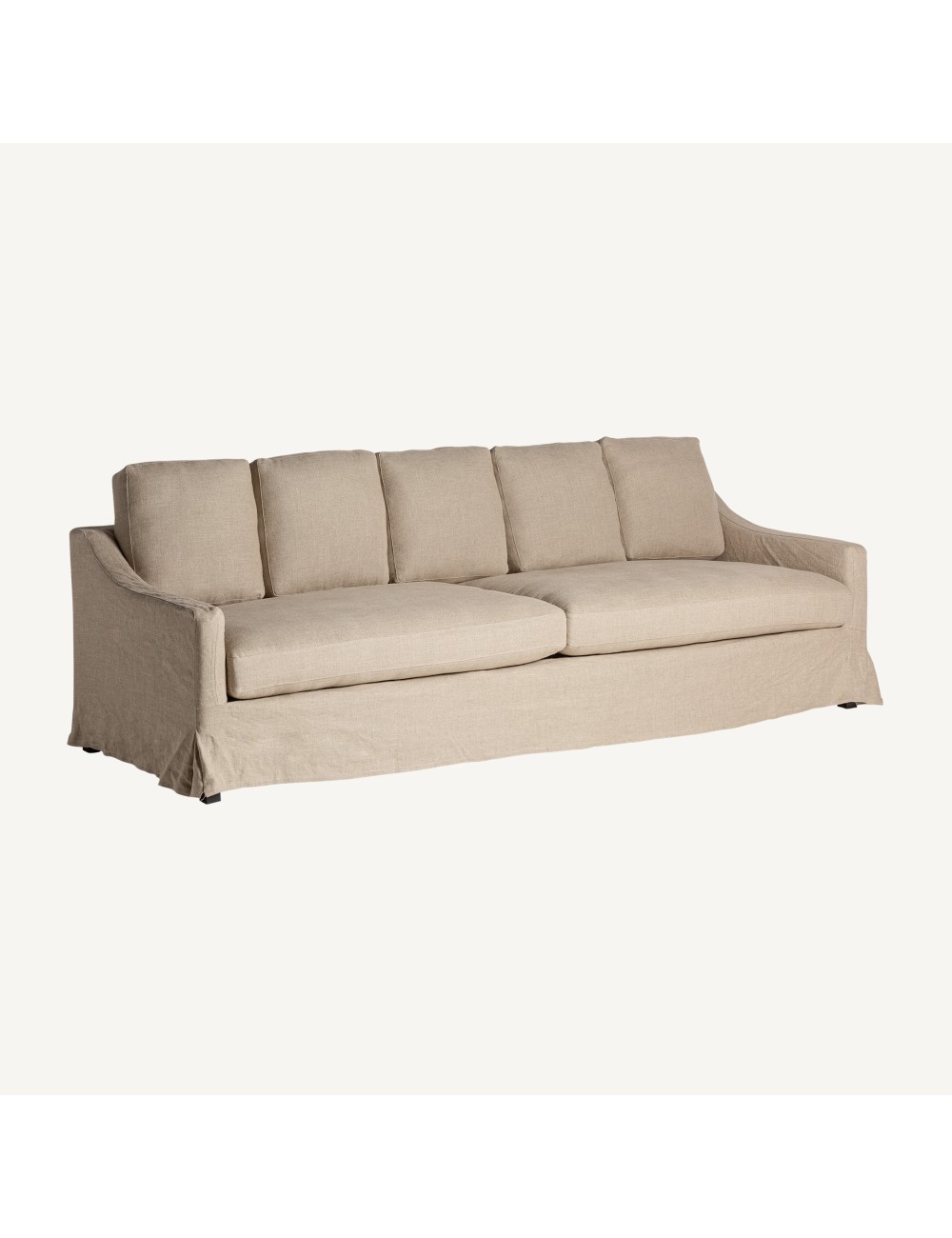 Sofá perlez, en color beige, de estilo colonial. Fabricado en madera de pino, combinado con madera de caucho y lino. Producto desenfundable.