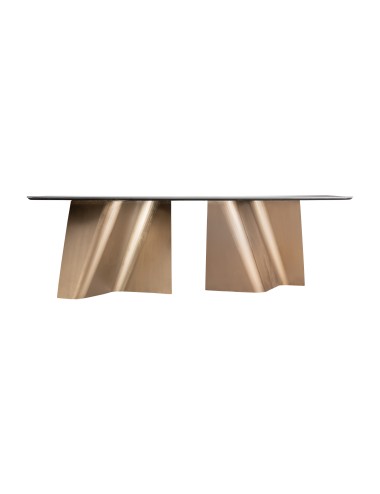 Mesa comedor tux, en color negro/marrón, de estilo art deco. Fabricado en porcelánico, combinado con acero. Producto desmontable.