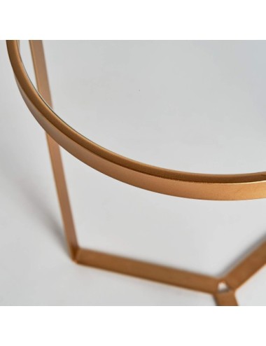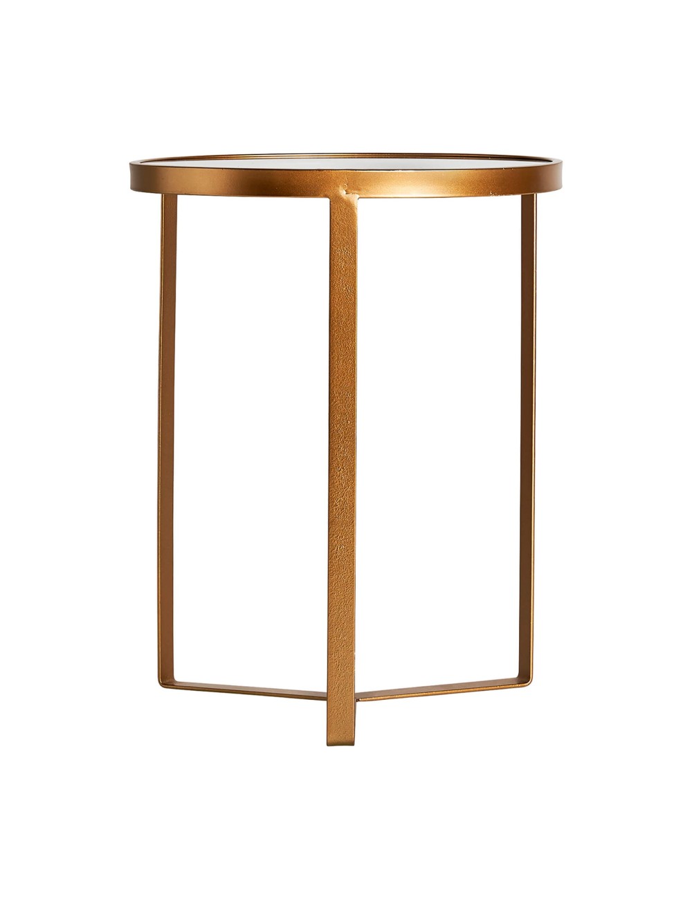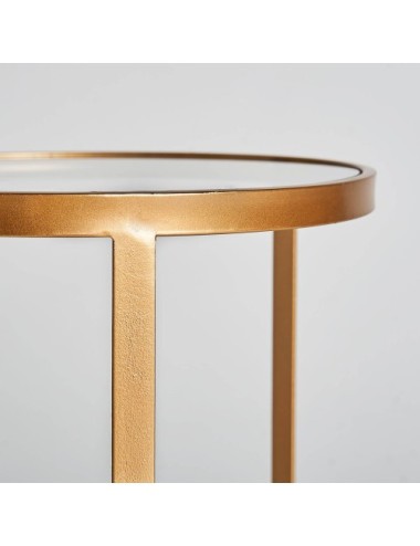 Mesa auxiliar redonda bleg, en color blanco/oro, de estilo art deco. Fabricado en hierro, combinado con vidrio. Producto desmontable.