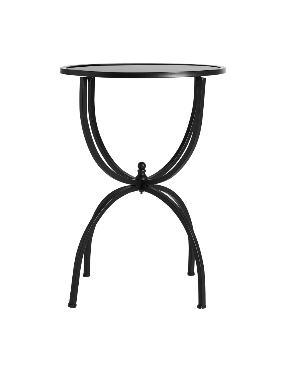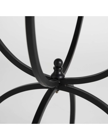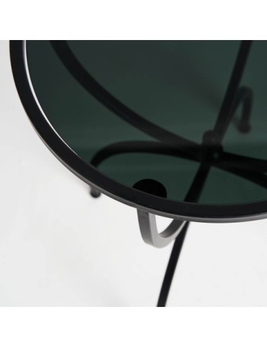 Mesa auxiliar redonda cailar, en color negro, de estilo industrial. Fabricado en hierro, combinado con vidrio. Negro fumé. Producto desmontable.