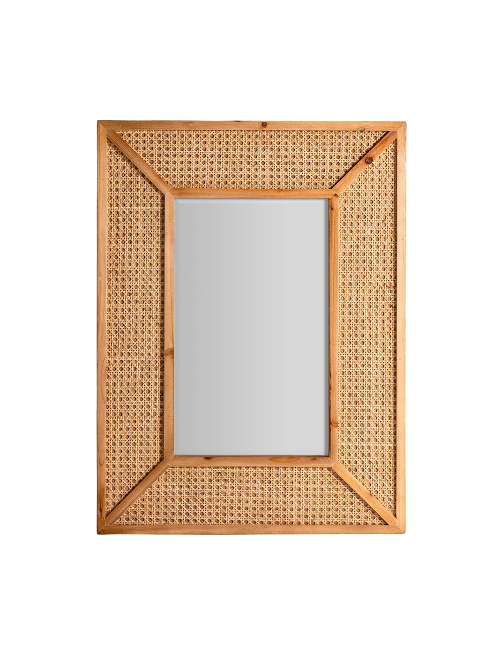 Espejo rectangular zetel, en color marrón, de estilo contemporáneo. Fabricado en hierro, combinado con ratán y madera dm.