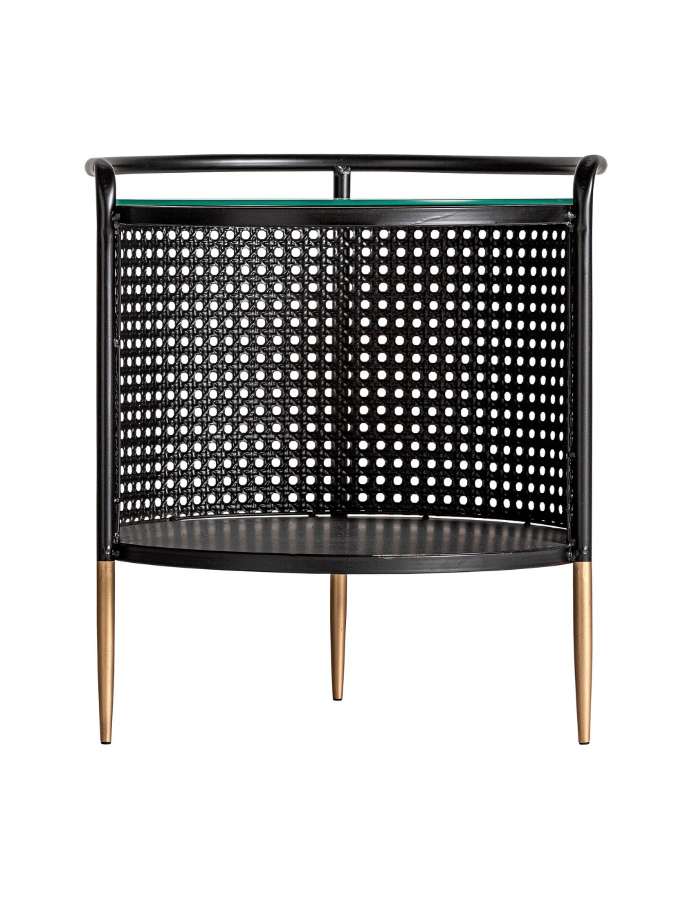 Mesa auxiliar redonda fussen, en color negro/oro, de estilo art deco. Fabricado en hierro, combinado con vidrio. Producto desmontable.