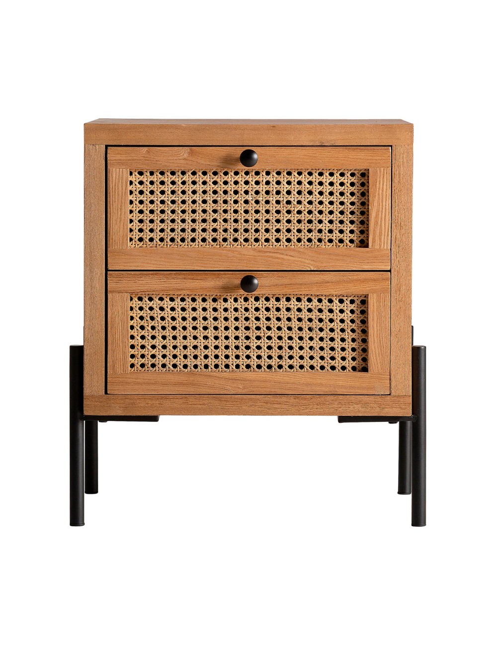 Mesita de noche cuadrada zetel de estilo contemporáneo, fabricado en madera dm en color marrón, combinado con ratán y hierro. Producto desmontable. | Mesita de noche rectangular doazit, en color marrón claro, de estilo nórdico. Fabricado en madera de abeto, combinado con madera dm. Producto desmontable. | Mesita de noche cuadrada brussa de estilo contemporáneo, fabricado en madera dm en color marrón, combinado con hierro en color negro. |