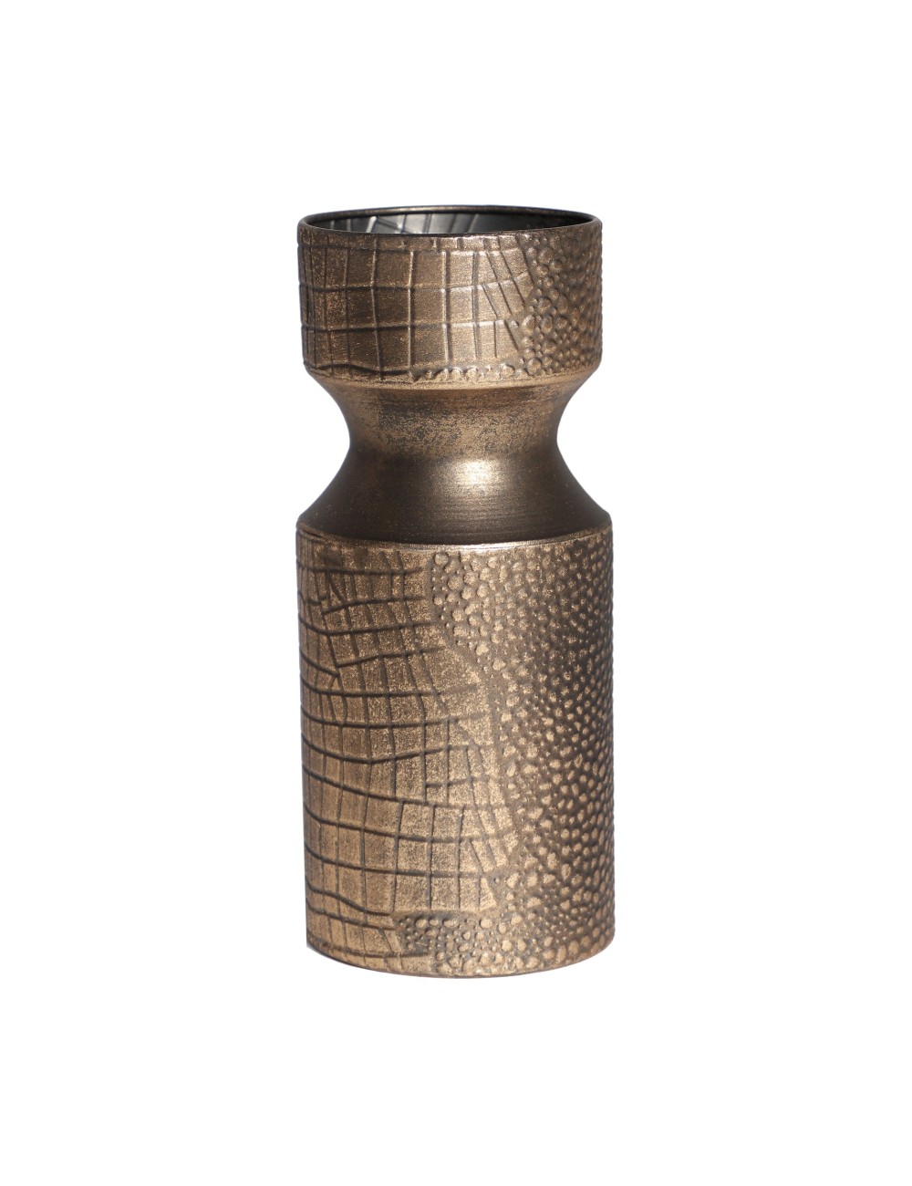 Jarrón redondo vesc de estilo art deco, fabricado en acero en color oro con acabado antic.