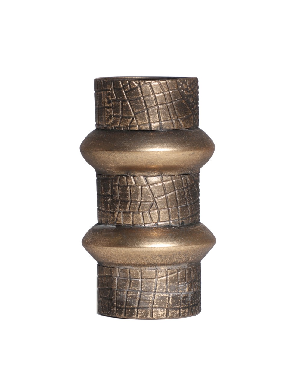 Jarrón redondo vesc de estilo art deco, fabricado en hierro en color oro con acabado antic.