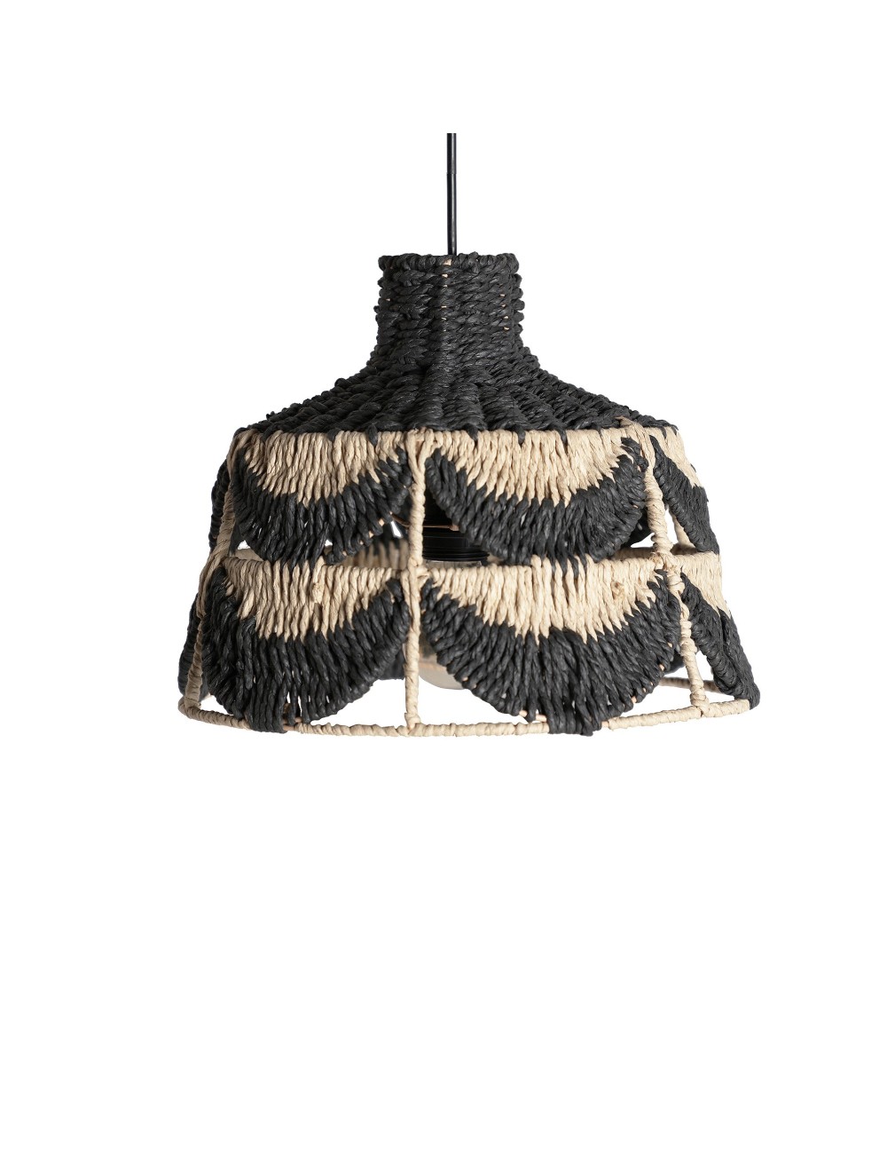 Lámpara de colgar redonda lisse de estilo boho, fabricado en fibra natural en color negro, combinado con cuerda en color natural y hierro.