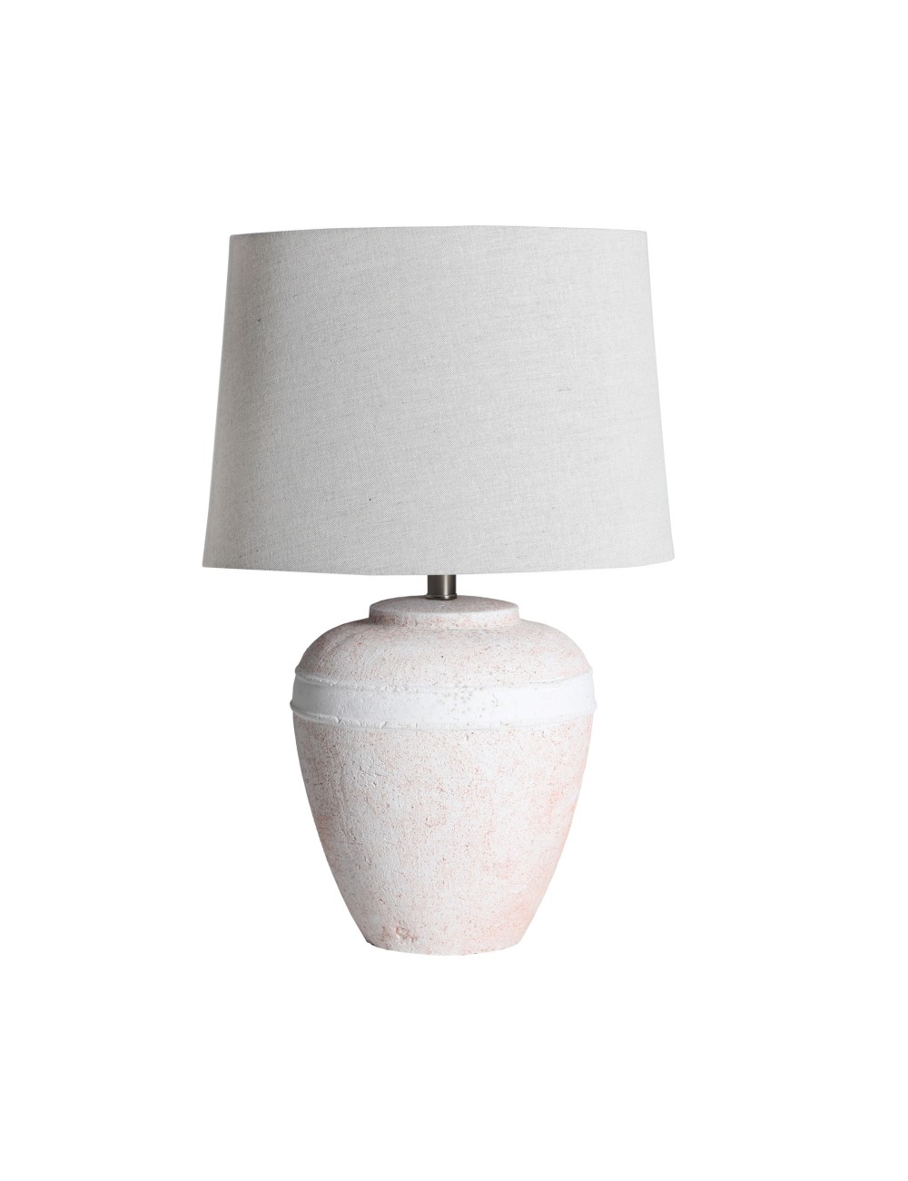 Lámpara de sobremesa Helina de estilo provenzal, fabricado en cerámica en color tonos claros con acabado envejecido, combinado con hierro en color plata y lino en color blanco roto. Producto desmontable.