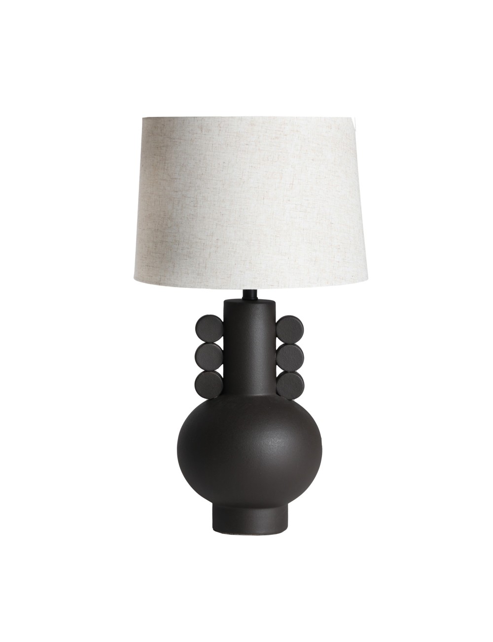 Lámpara de sobremesa oksana de estilo provenzal, fabricado en cerámica en color negro, combinado con hierro en color natural y lino en color blanco roto. Producto desmontable.