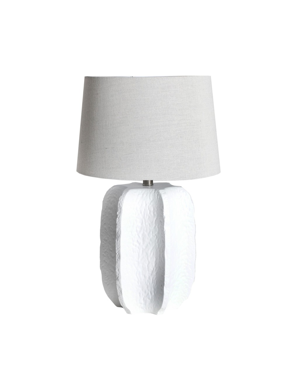 Lámpara de sobremesa redonda queila de estilo provenzal, fabricado en cerámica en color blanco, combinado con hierro en color plata y lino en color blanco roto. Producto desmontable.