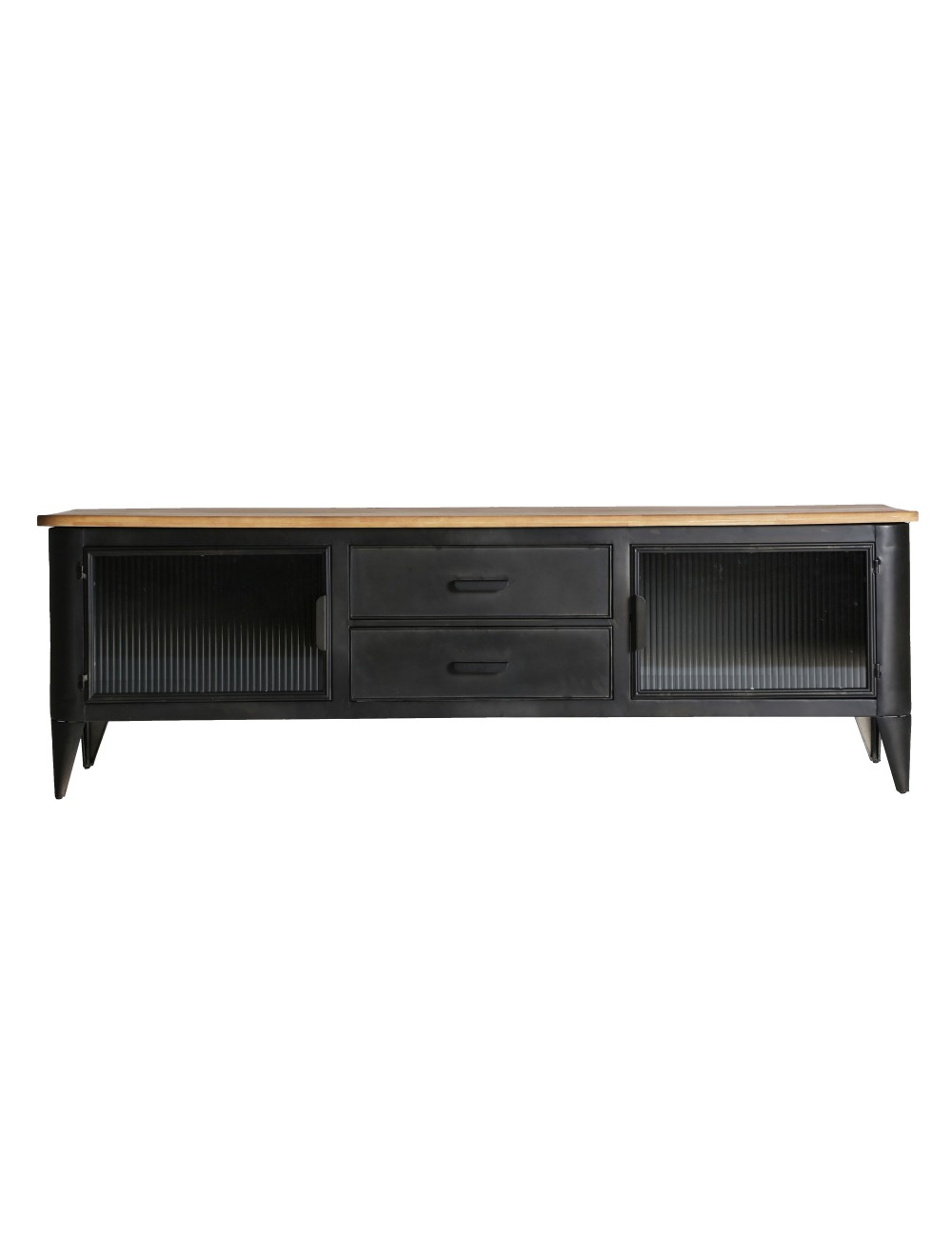 Mueble tv Easby de estilo industrial, fabricado en hierro en color negro, combinado con vidrio en color transparente con acabado traslúcido y madera de caucho en color marrón.