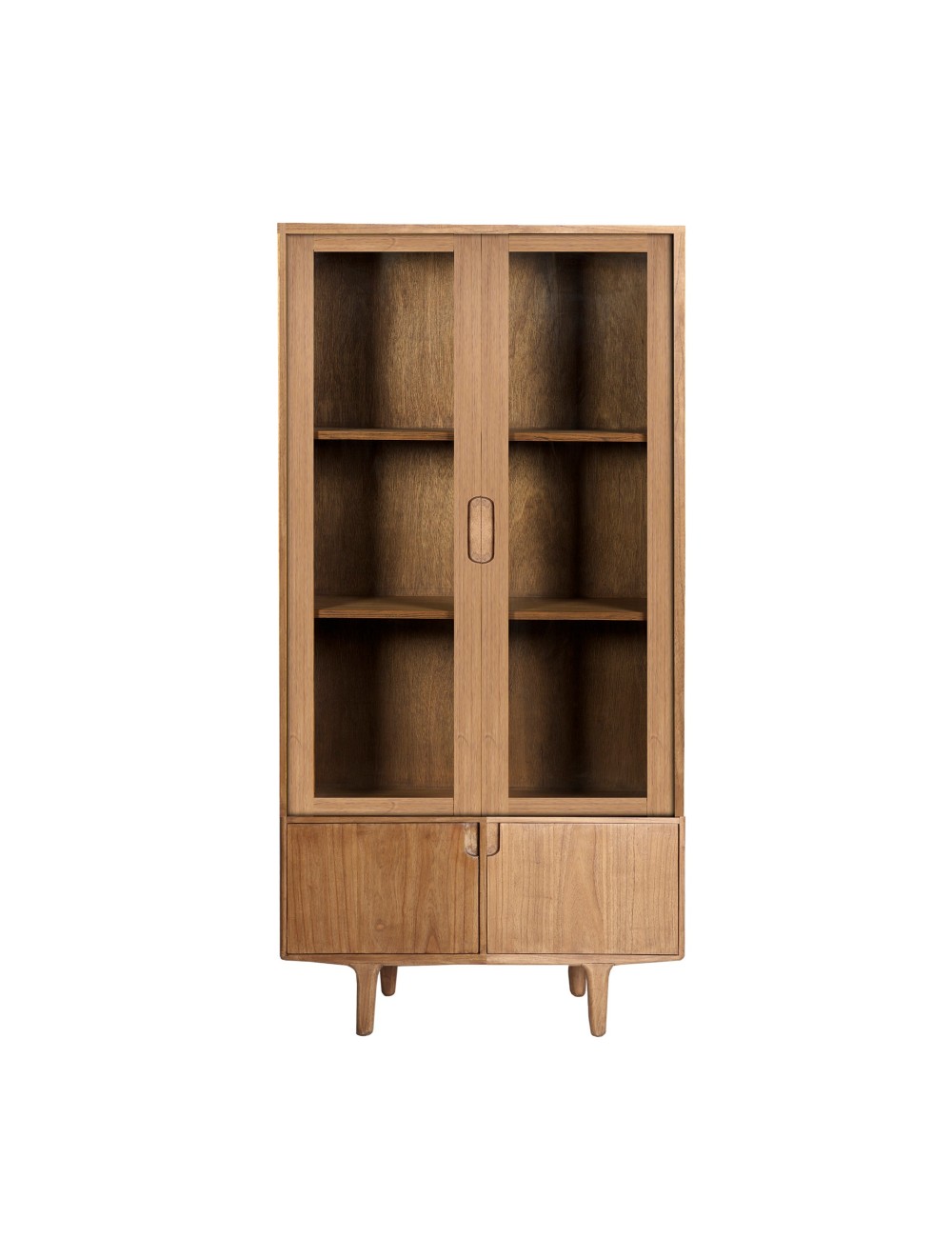Vitrina Kamenz de estilo nórdico, fabricado en madera mindi en color marrón, combinado con madera contrachapada y cristal. Producto desmontable.