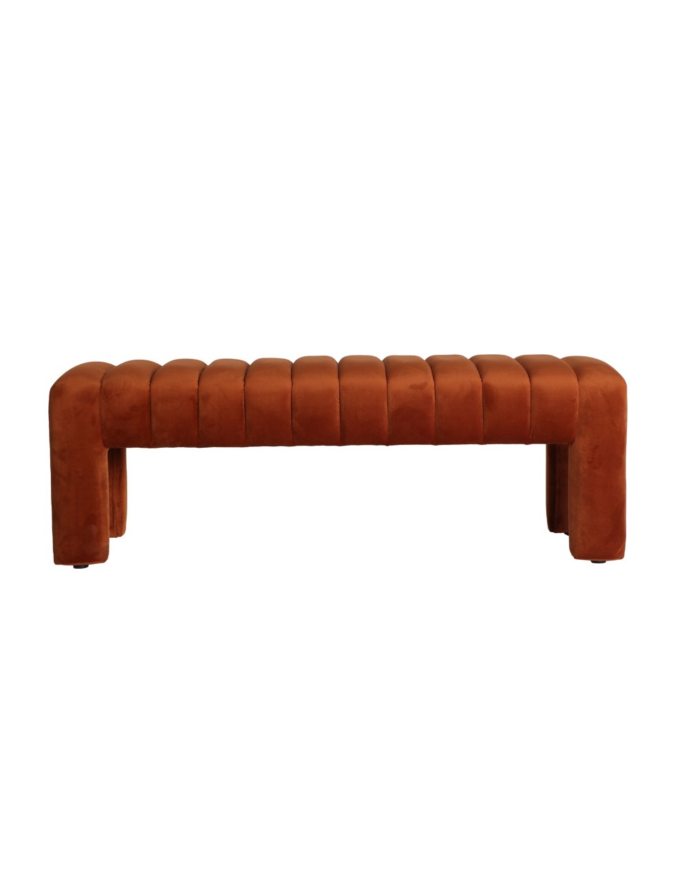 Pie de cama rectangular halle de estilo contemporáneo, fabricado en terciopelo en color ambar, combinado con madera contrachapada y espuma.