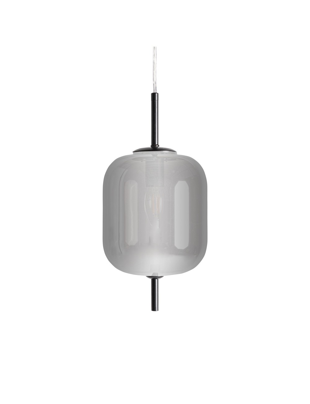 Lámpara de colgar Zuri de estilo art deco, fabricado en vidrio en color plata con acabado ahumado, combinado con acero en color negro con acabado mate. Producto desmontable.