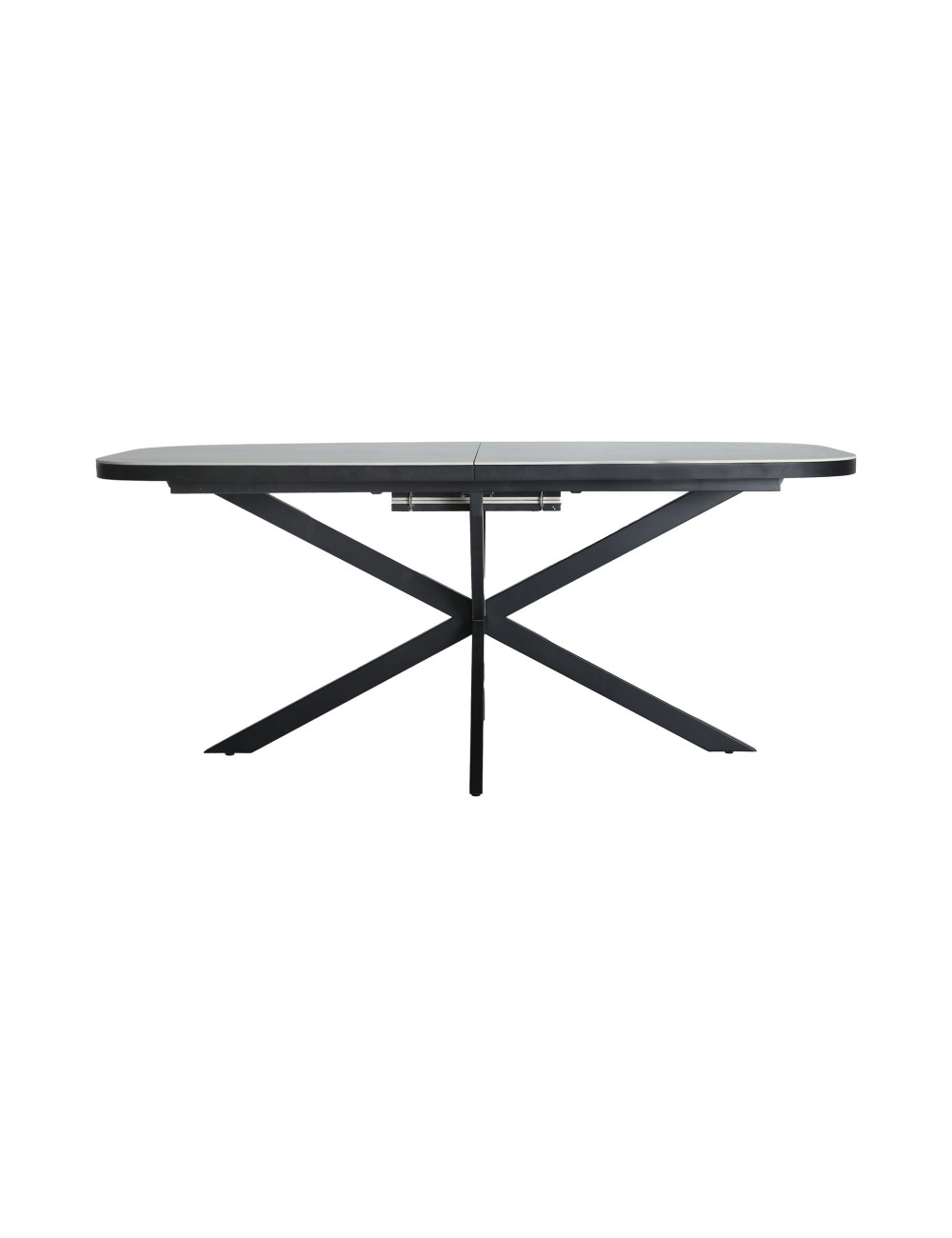 Mesa extensible Droux de estilo contemporáneo, fabricado en madera dm en color blanco, combinado con cerámica en color blanco y hierro en color negro. Producto desmontable, extensible.