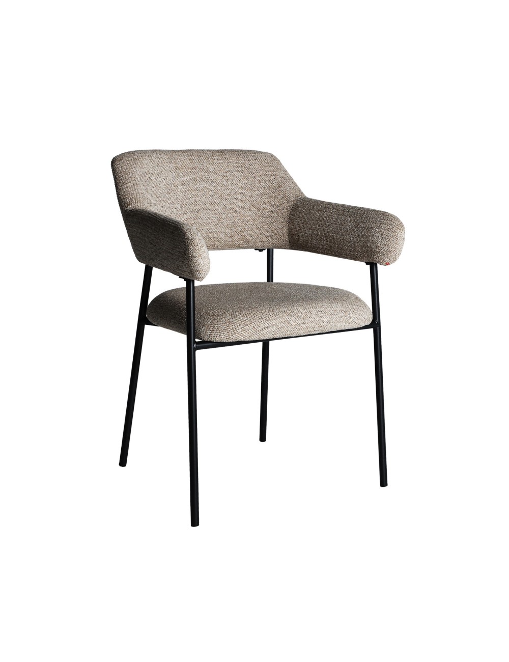 Silla Sarzay de estilo contemporáneo, fabricado en poliéster en color marrón claro con acabado jaspeado, combinado con hierro en color negro y madera dm. Producto desmontable.
