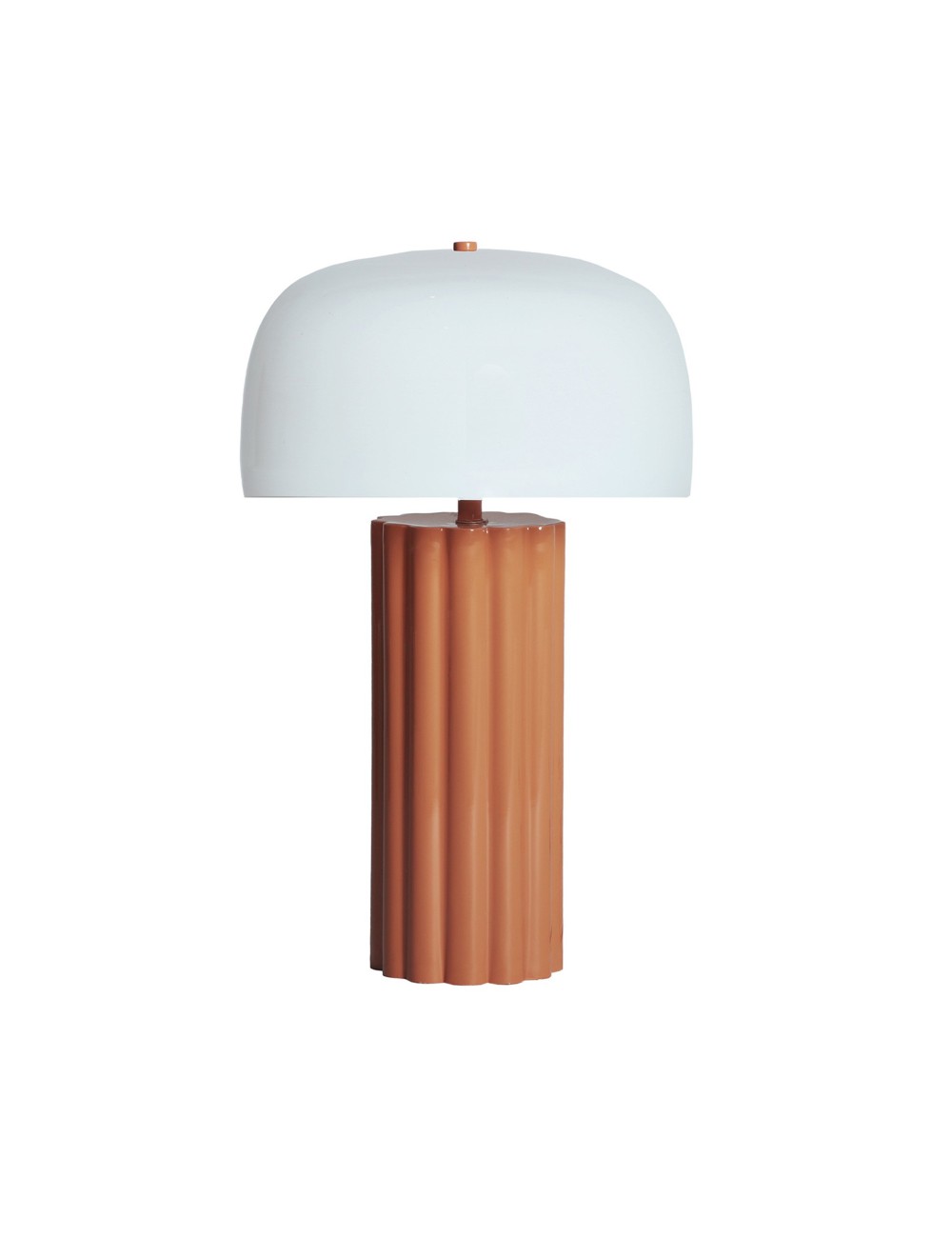 Lámpara de sobremesa Tresa de estilo moderno, fabricado en hierro en color terracota con acabado brillo, combinado con vidrio en color blanco. Producto desmontable.