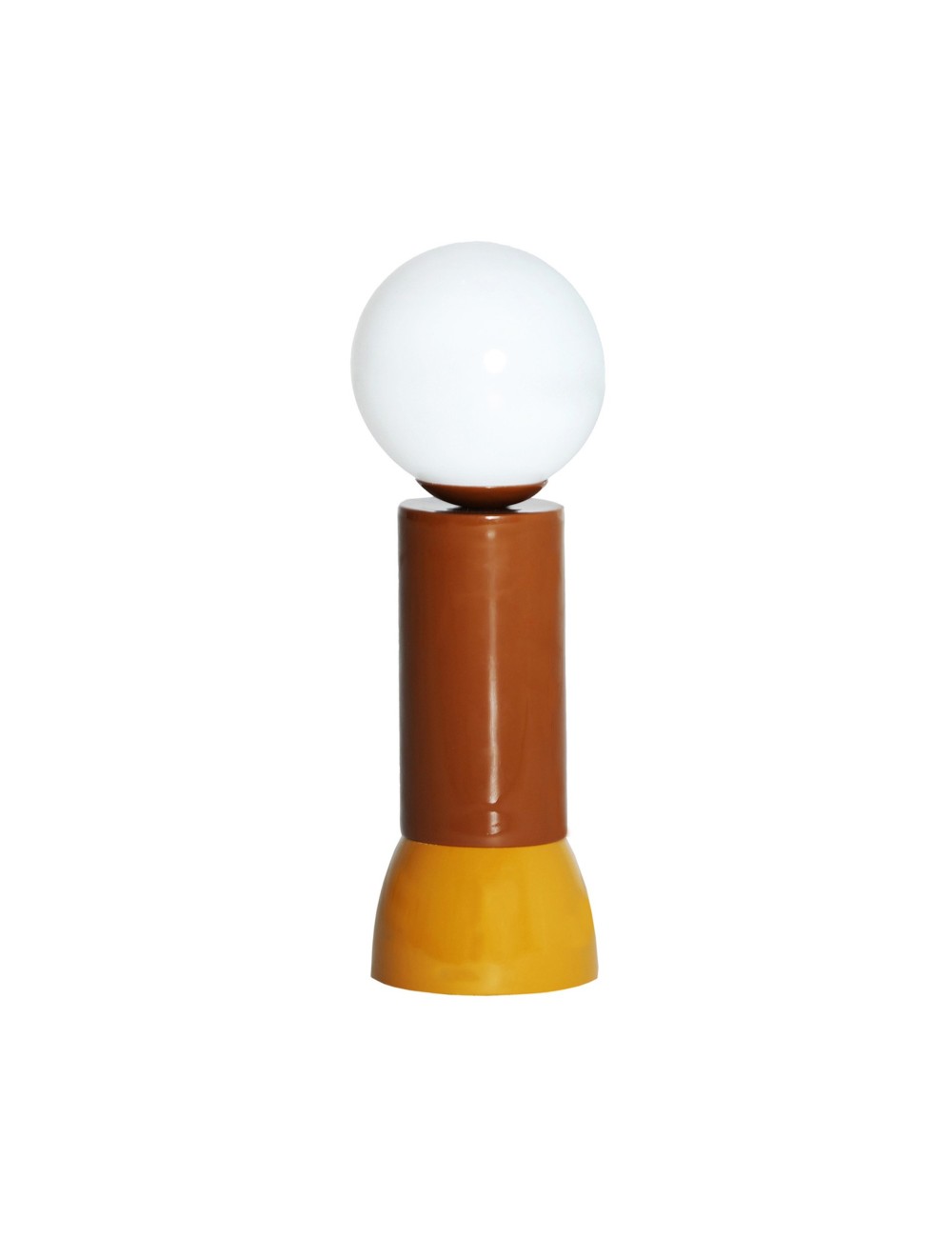 Lámpara de sobremesa Manarola de estilo moderno, fabricado en hierro en color mostaza en color marrón y vidrio en color blanco. Producto desmontable.