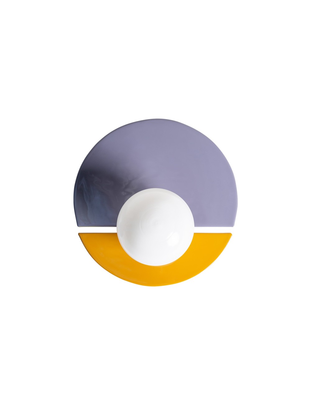 Aplique Niza de estilo moderno, fabricado en hierro en color morado en color mostaza y vidrio en color blanco. Producto desmontable.