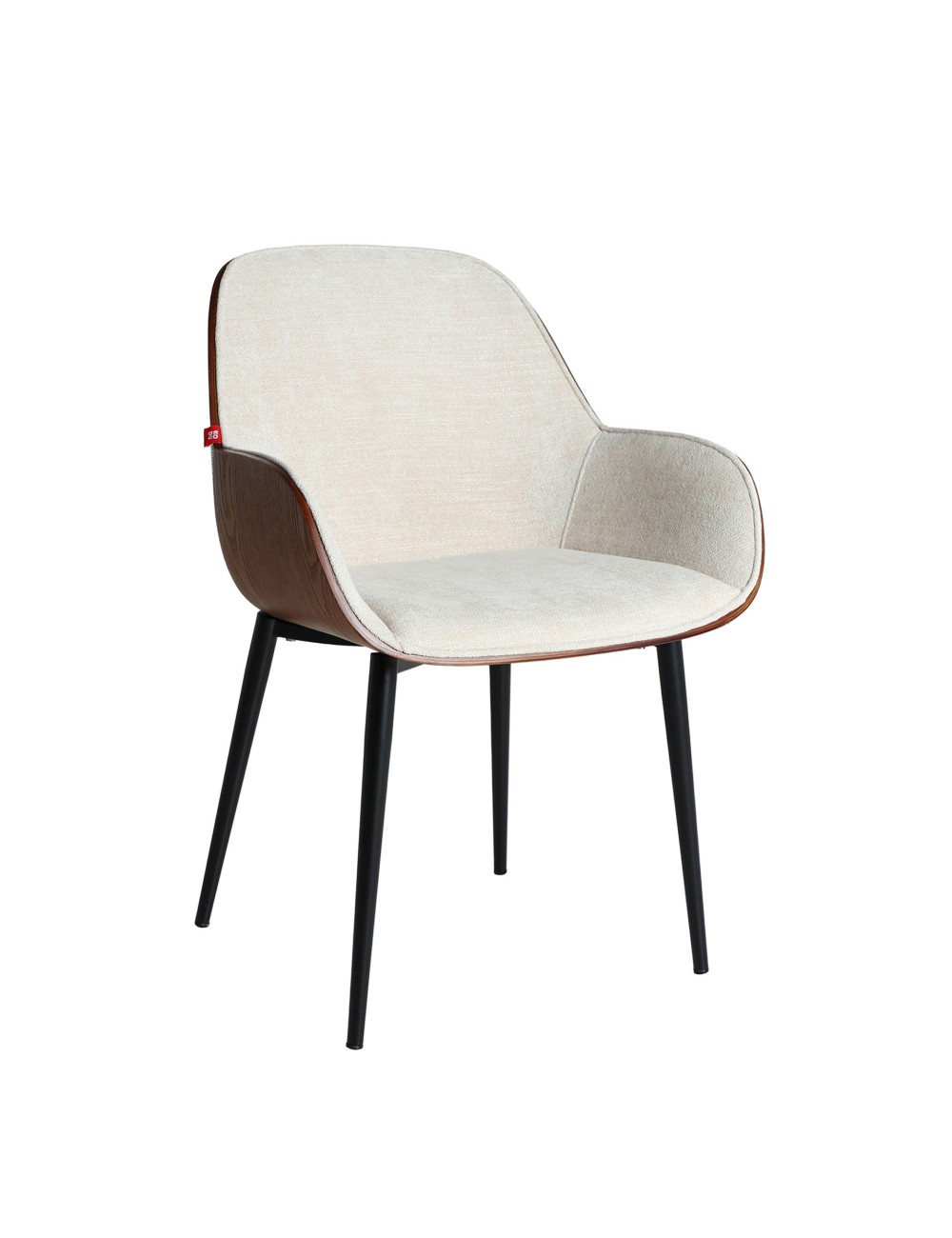 Silla Beesd de estilo moderno, fabricado en madera contrachapada en color marrón, combinado con poliéster en color blanco roto y aluminio en color negro.