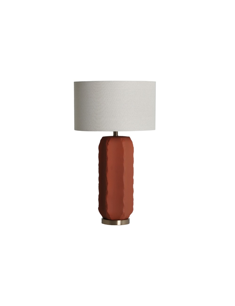 Lámpara de sobremesa Argila de estilo contemporáneo, fabricado en cerámica en color terracota, combinado con acero en color dorado y lino en color blanco roto. Producto desmontable.