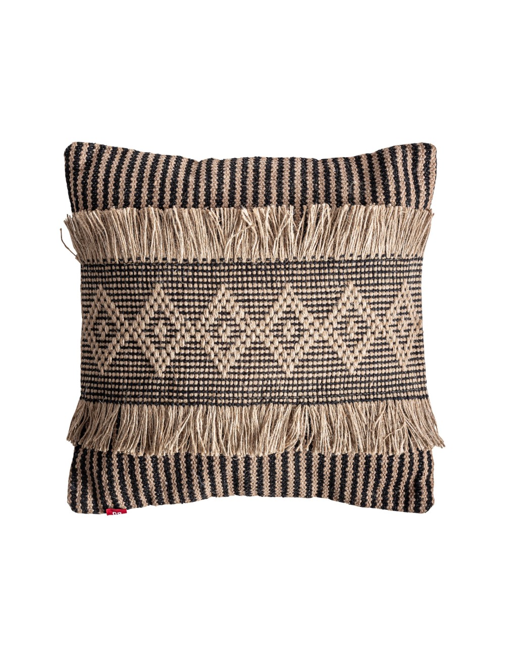 Cojín Blahir de estilo boho, fabricado en yute en color marrón claro, combinado con poliéster en color negro. Producto desenfundable.