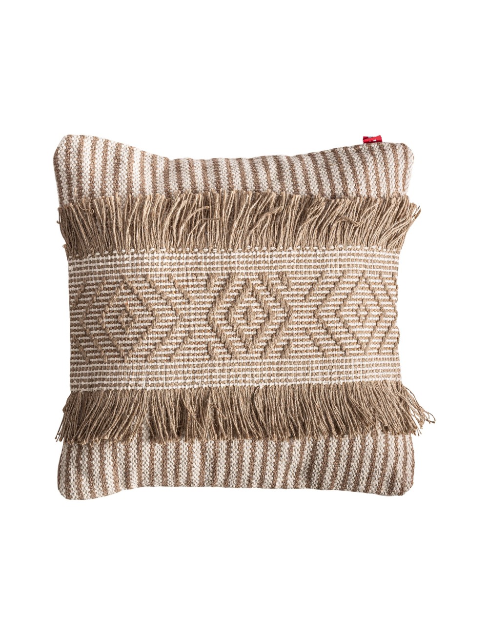 Cojín Serafin de estilo boho, fabricado en yute en color beige, combinado con poliéster en color marrón.