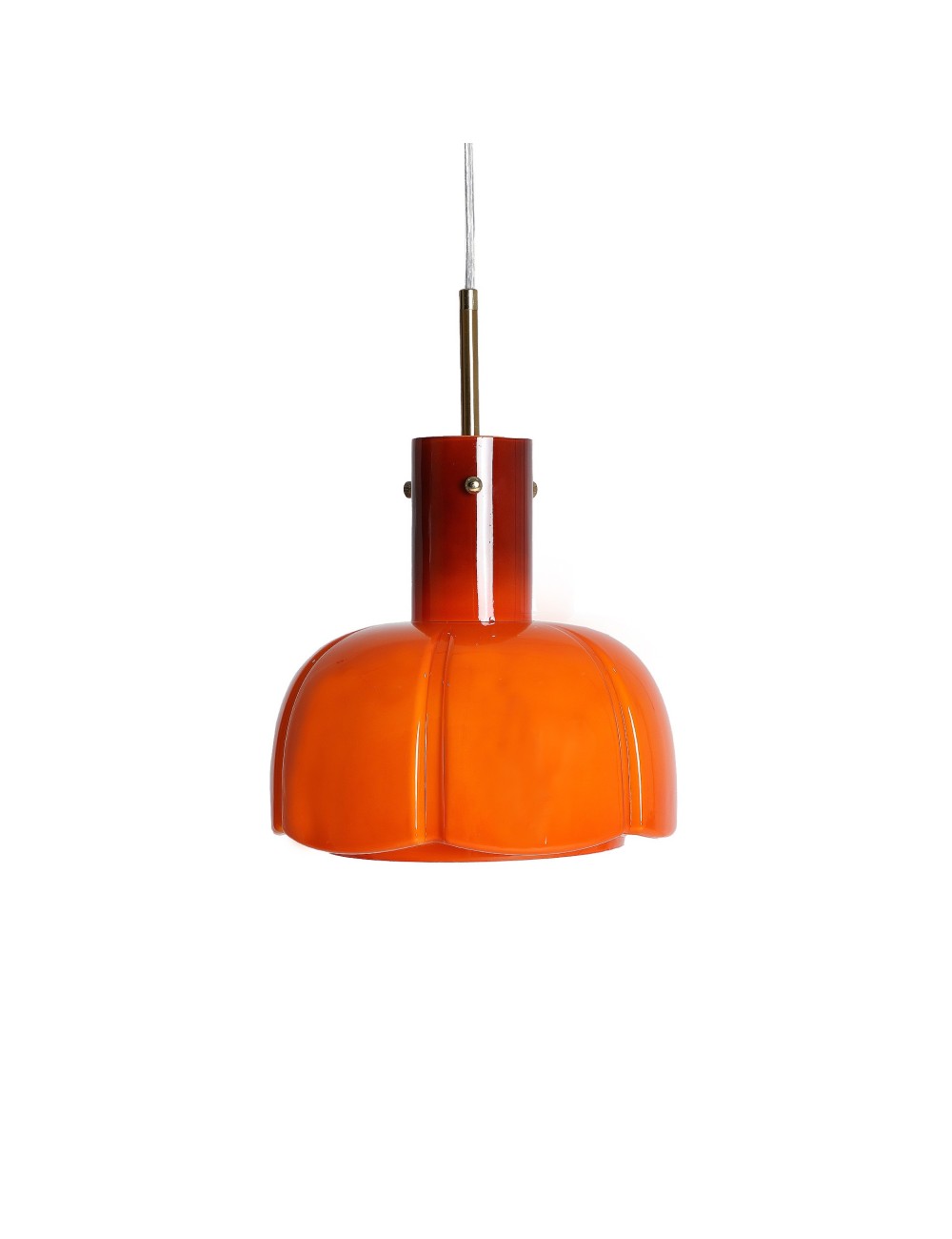 Lámpara de colgar Adara de estilo contemporáneo, fabricado en cristal en color naranja con acabado liso, combinado con hierro en color oro. Producto desmontable.