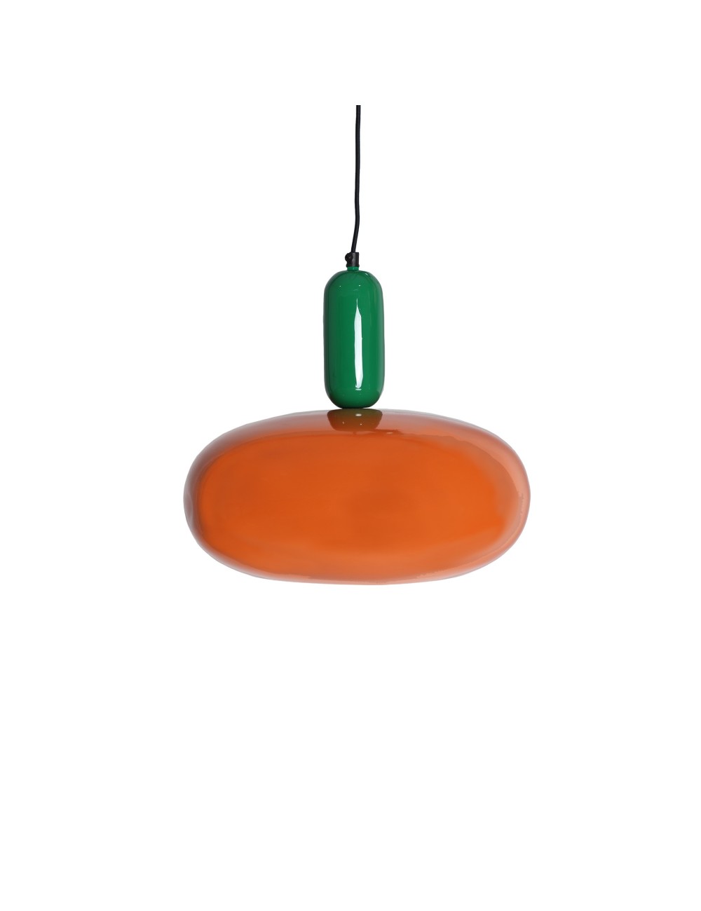 Lámpara de colgar Falhia de estilo contemporáneo, fabricado en hierro en color naranja con acabado brillo, combinado con hierro en color verde con acabado brillo.