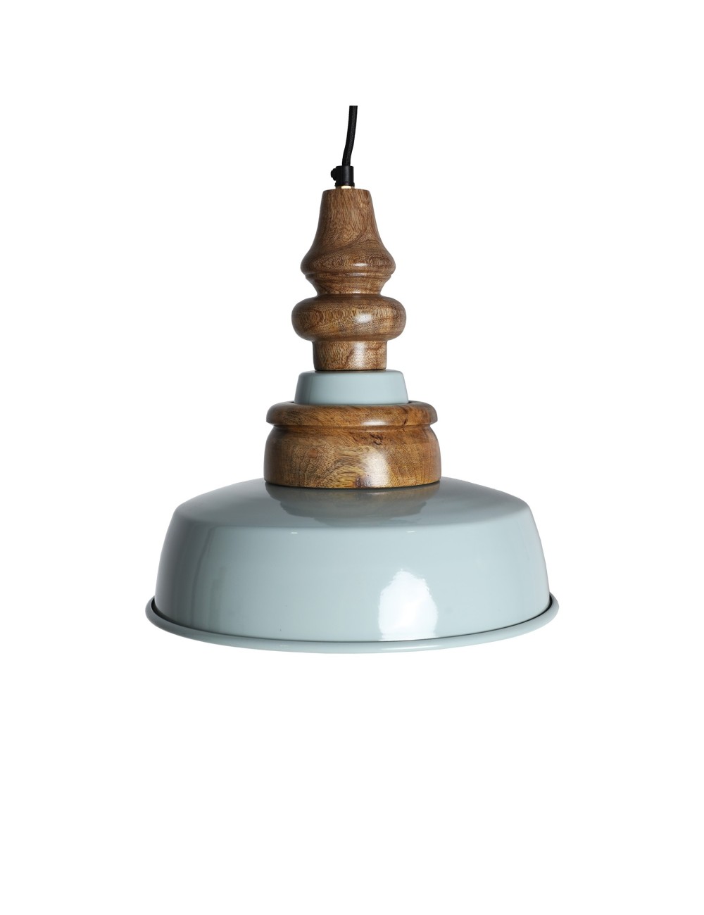 Lámpara de colgar Fizzi de estilo contemporáneo, fabricado en hierro en color azul con acabado brillo, combinado con madera de mango en color marrón con acabado natural.