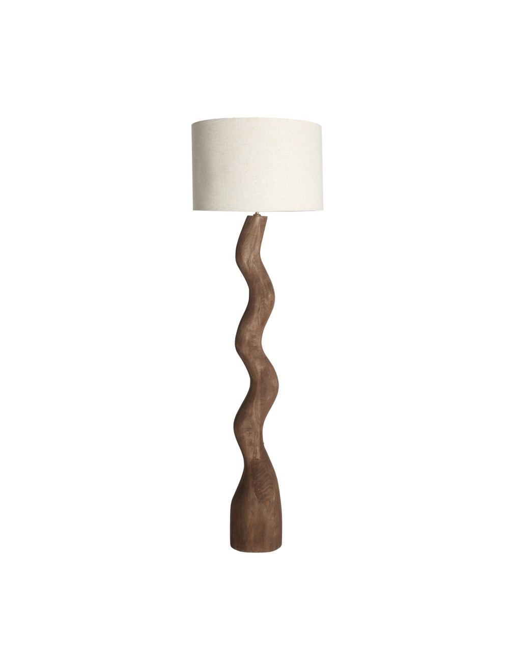Lámpara de pie Onda de estilo clásico, fabricado en madera de mango en color marrón, combinado con lino en color crema. Producto desmontable.