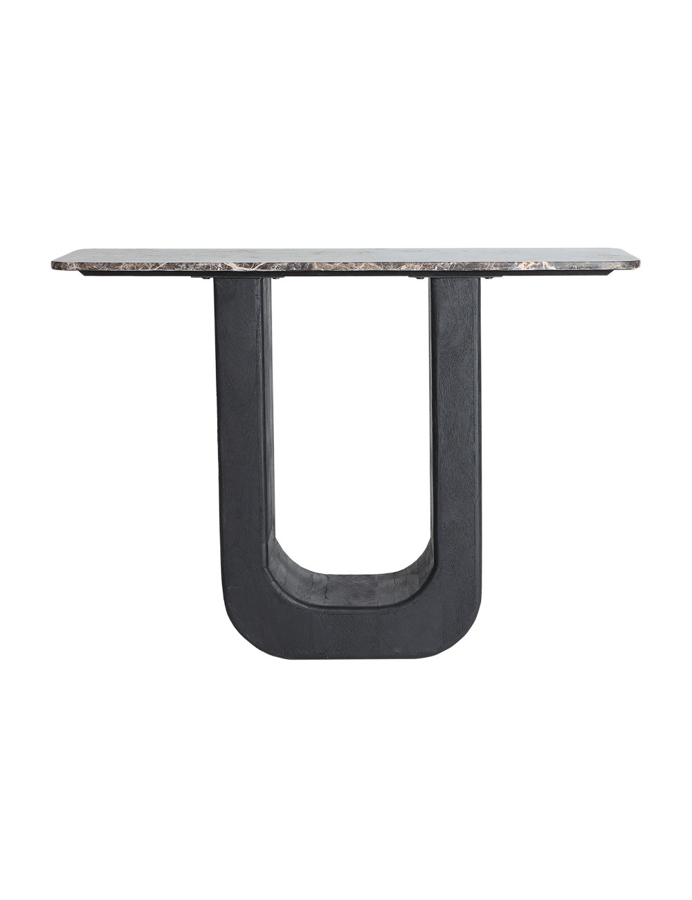 Consola Loop de estilo contemporáneo, fabricado en madera de mango en color negra, combinado con mármol en color marrón con acabado veteado. Producto desmontable.