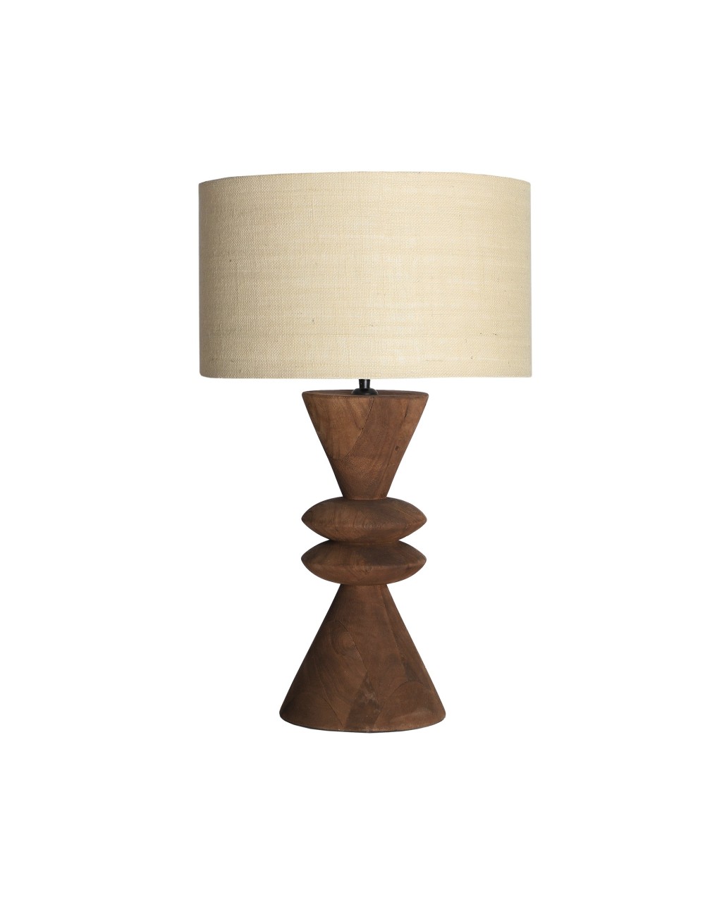 Lámpara de sobremesa Shama de estilo contemporáneo, fabricado en madera de mango en color marrón, combinado con lino en color beige. Producto desmontable.