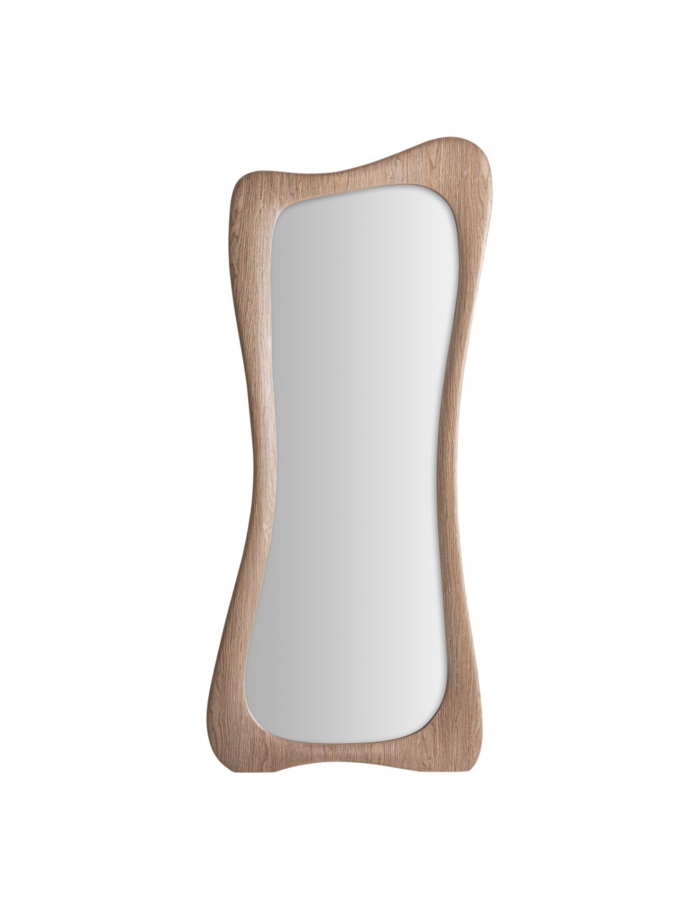 Espejo Lira de estilo contemporáneo, fabricado en madera dm en color marrón claro, combinado con chapa de madera y espejo. | Espejo redondo tsumeb, en color natural envejecido, de estilo étnico. Fabricado en madera de teka, combinado con vidrio. | Espejo giekau, en color marrón, de estilo colonial. Fabricado en madera abedul, combinado con espejo. | Espejo haner, en color negro/oro, de estilo art deco. Fabricado en resina. |