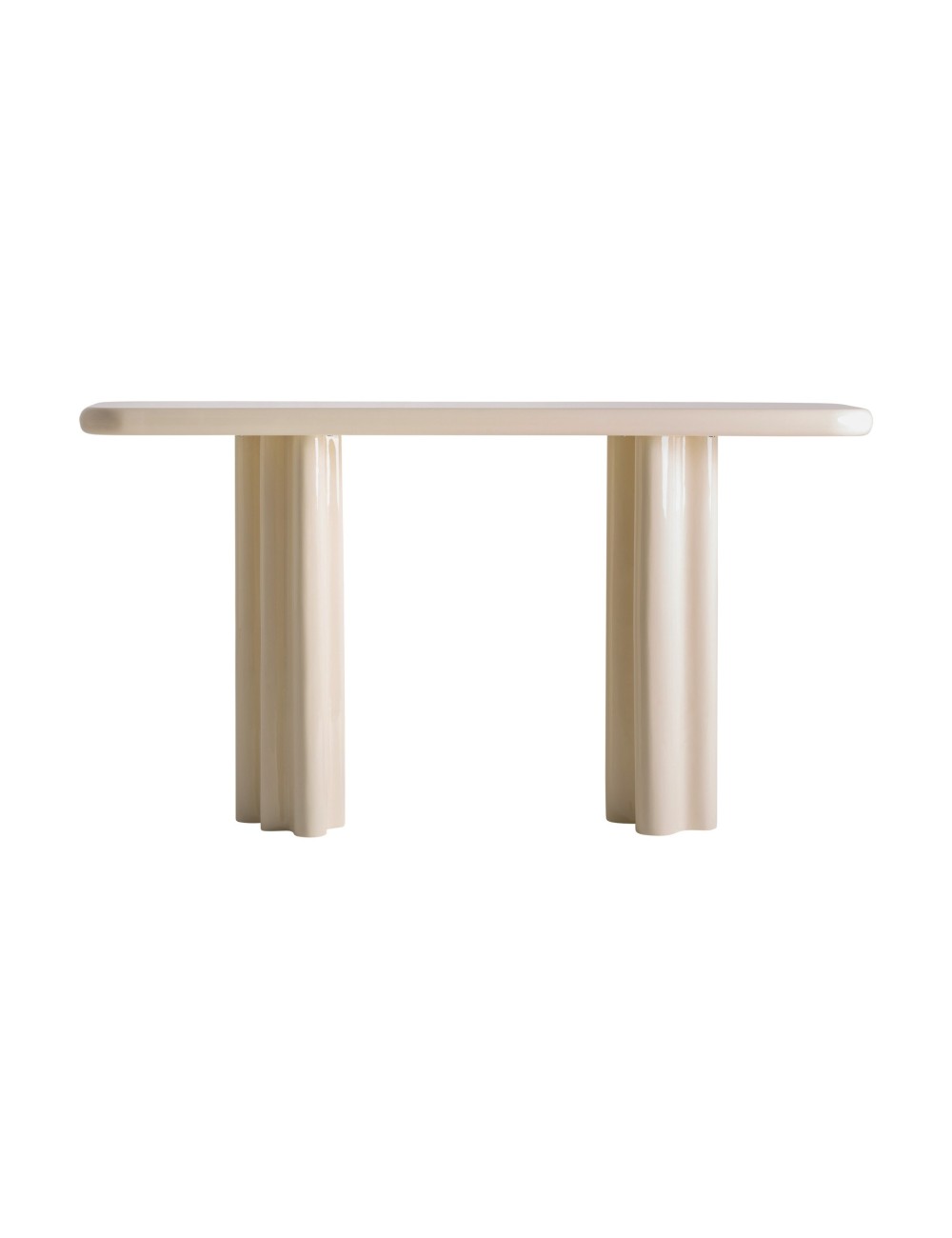 Consola Alba de estilo contemporáneo, fabricado en madera dm en color crema. Producto desmontable. | Consola rectangular kohlen, en color negro/marrón, de estilo art deco. Fabricado en madera de abeto, combinado con madera dm y hierro. | Consola Arko de estilo contemporáneo, fabricado en madera dm en color marrón, combinado con chapa de madera. | Consola Root de estilo contemporáneo, fabricado en madera dm en color verde, combinado con chapa de madera en color marrón. Producto desmontable. |