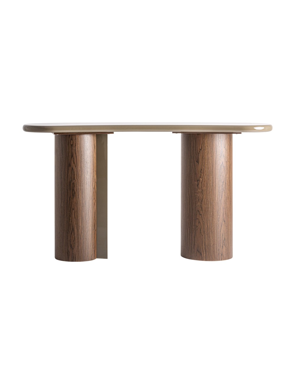 Consola Root de estilo contemporáneo, fabricado en madera dm en color verde, combinado con chapa de madera en color marrón. Producto desmontable. | Consola rectangular kohlen, en color negro/marrón, de estilo art deco. Fabricado en madera de abeto, combinado con madera dm y hierro. | Consola Arko de estilo contemporáneo, fabricado en madera dm en color marrón, combinado con chapa de madera. | Consola Alba de estilo contemporáneo, fabricado en madera dm en color crema. Producto desmontable. |