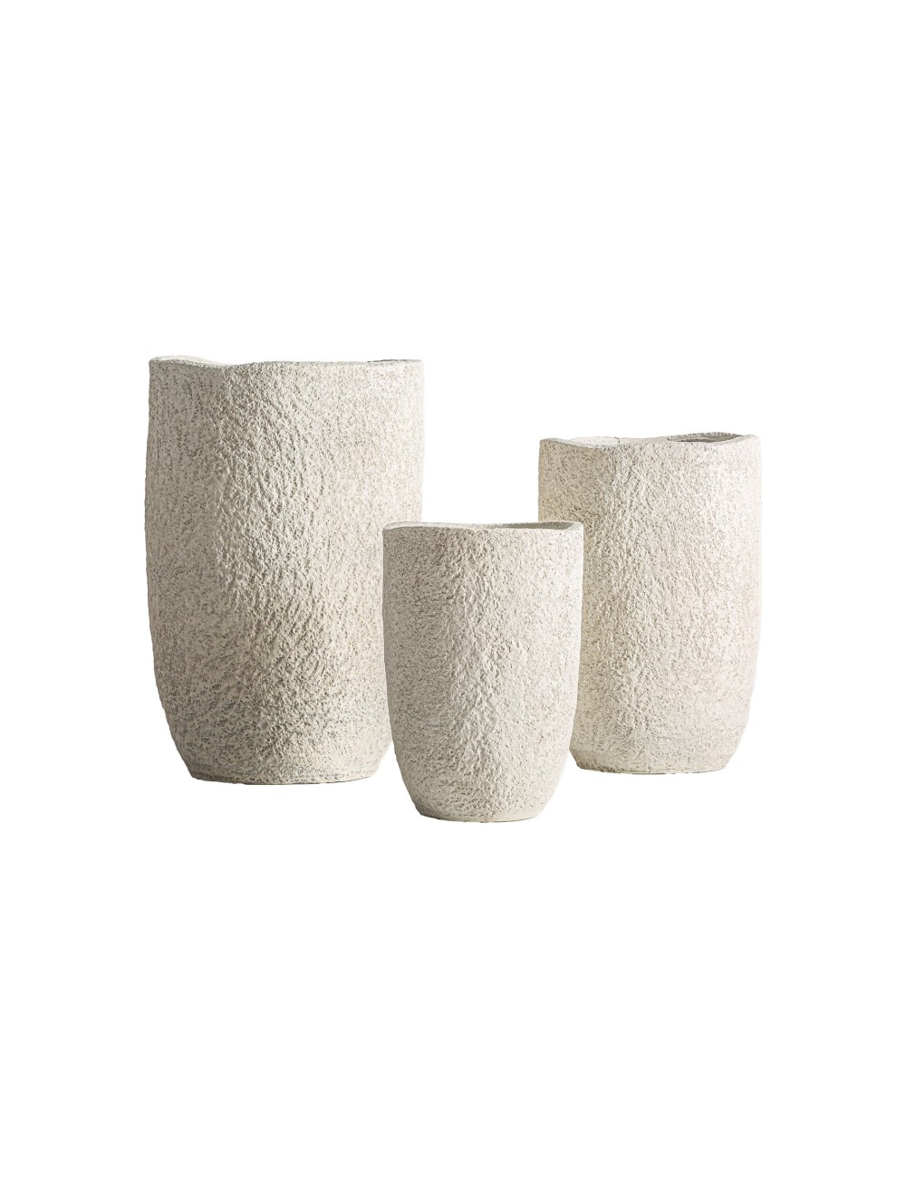 Macetero j/3 Massa de estilo minimalista, fabricado en cerámica en color blanco roto con acabado rugoso. Macetero j/3 Aila de estilo contemporáneo, fabricado en cerámica en color blanco roto. Macetero Elmur de estilo contemporáneo, fabricado en poliresina en color blanco roto. Macetero Sanden de estilo contemporáneo, fabricado en poliresina en color gris.