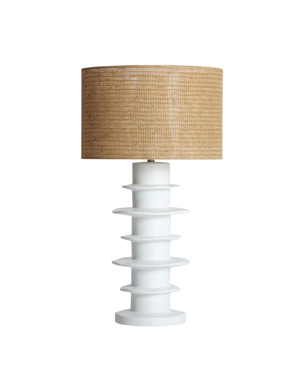 Lámpara de sobremesa Faroa de estilo contemporáneo, fabricado en cerámica en color blanco con acabado mate, combinado con rafia en color marrón. Producto desmontable.