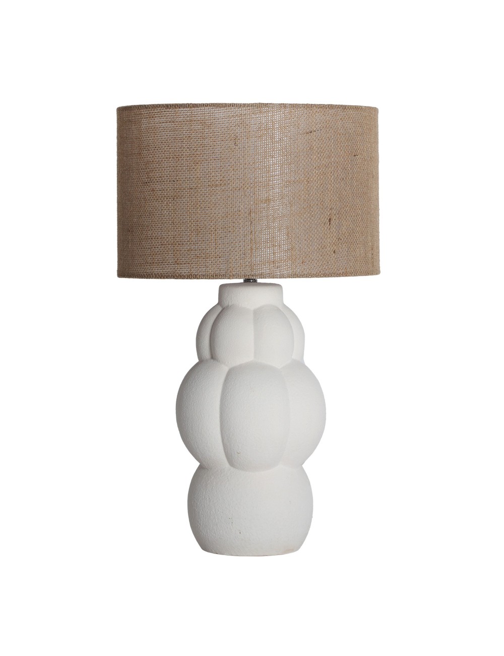 Lámpara de sobremesa Bulla de estilo contemporáneo, fabricado en cerámica en color blanco roto, combinado con poliéster en color marrón. Producto desmontable.
