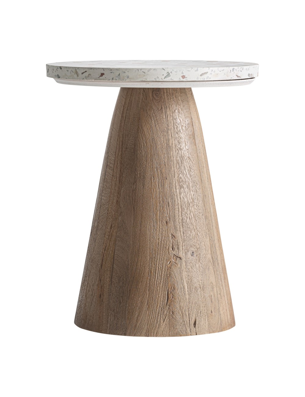 Mesa auxiliar Lautrec de estilo nórdico, fabricado en terrazo en color blanco, combinado con madera de mango en color marrón. Producto desmontable.