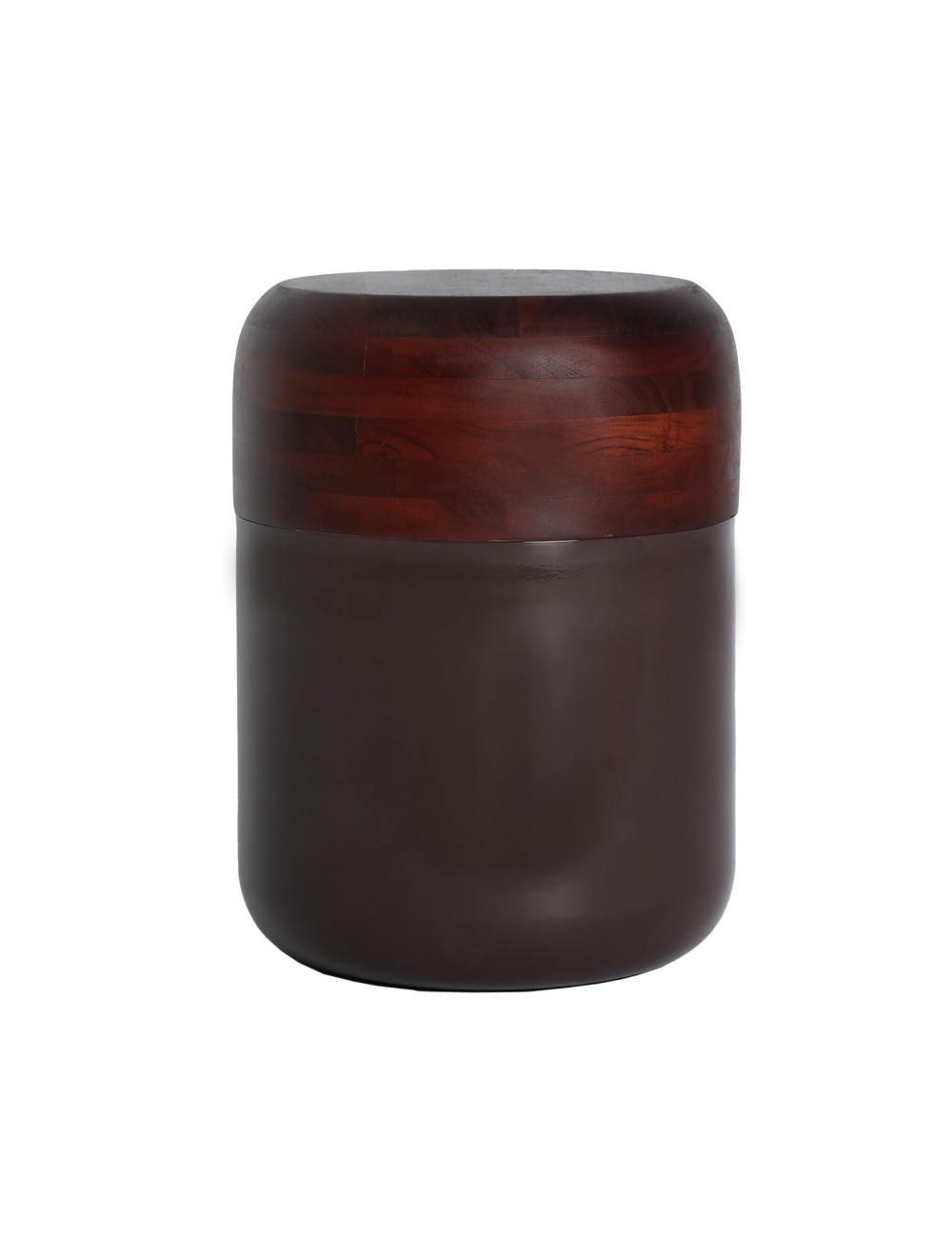 Mesa auxiliar Tau de estilo contemporáneo, fabricado en hierro en color chocolate con acabado brillo, combinado con madera de acacia en color marrón.