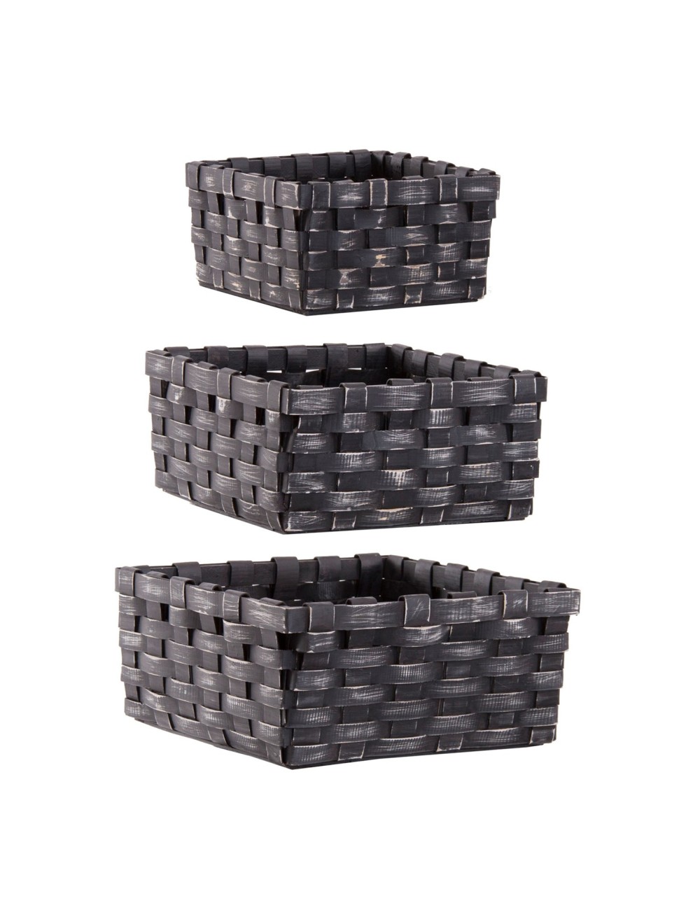 Cesta j 3 de estilo provenzal fabricado en mimbre en color negro. | Cesto Amalia de estilo vintage fabricado en ratán en color rojo. | Cesto Amalia de estilo vintage fabricado en ratán en color marrón combinado con algodón en color blanco. |