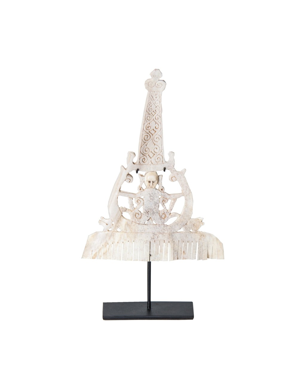 Figura decorativa de estilo étnico fabricado en madera tropical en color blanco roto combinado con hierro.