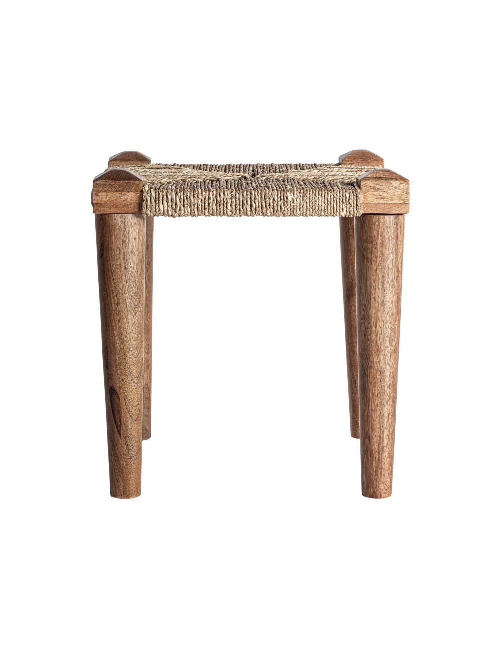 Taburete Kaaji de estilo étnico fabricado en madera de mango en color marrón combinado con yute. Producto desmontable. | Reposapiés Vayor de estilo nórdico fabricado en madera de mango en color marrón combinado con piel y espuma. | Reposapiés lux de estilo colonial fabricado en madera de teka en color marrón. | Puff kirho en color beige de estilo shabby chic. Fabricado en pet. |