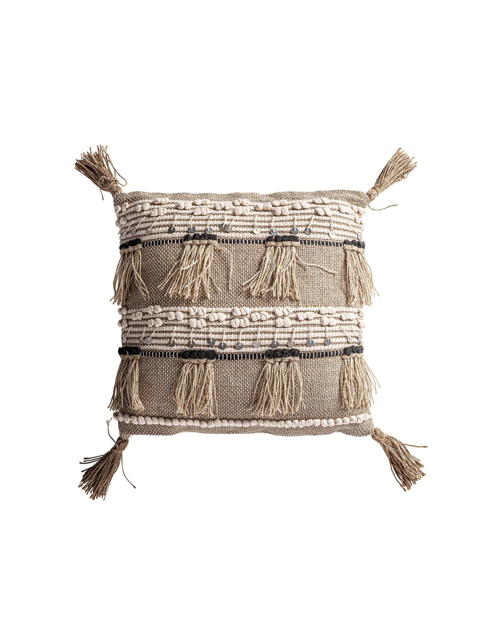 Cojín Mayla de estilo vintage fabricado en yute en color blanco con acabado bordado combinado con algodón en color natural.