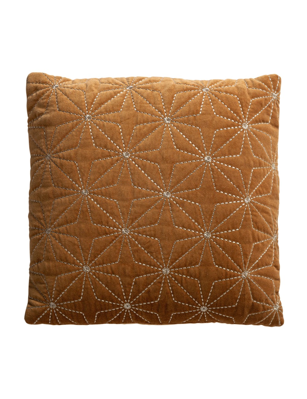 Cojín Vilma de estilo clásico fabricado en terciopelo en color ocre con acabado bordado combinado con algodón y poliéster. Producto desenfundable.