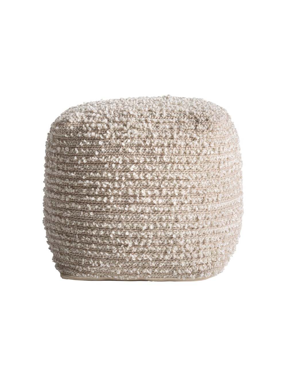 Puff aleph en color gris de estilo shabby chic. Fabricado en pet. | Reposapiés Vayor de estilo nórdico fabricado en madera de mango en color marrón combinado con piel y espuma. | Reposapiés lux de estilo colonial fabricado en madera de teka en color marrón. |