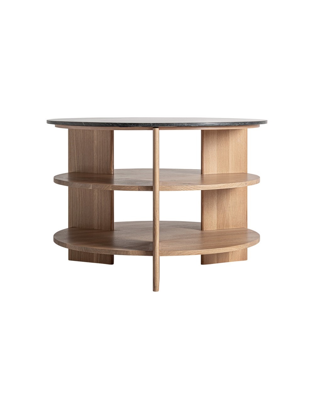 Mesa auxiliar Nara de estilo contemporáneo fabricado en madera roble en color marrón combinado con travertino en color negro. Producto desmontable.