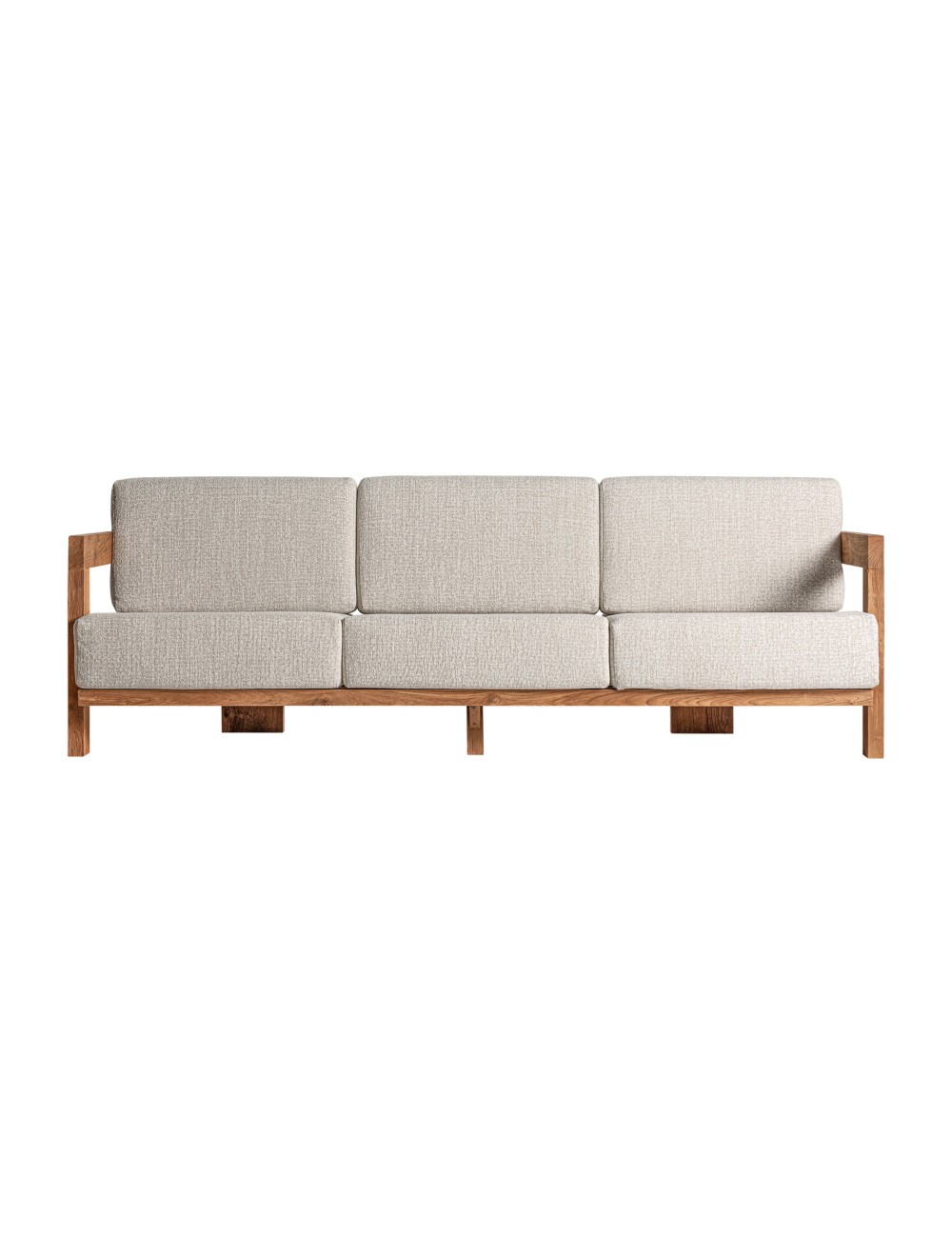 Sofá testa de estilo colonial fabricado en madera de teka reciclada en color marrón combinado con polipropileno reciclado y espuma. Producto desmontable desenfundable. | Sofá trena de estilo boho fabricado en madera de teka reciclada en color marrón combinado con polipropileno reciclado en color beige. Producto desmontable desenfundable. |