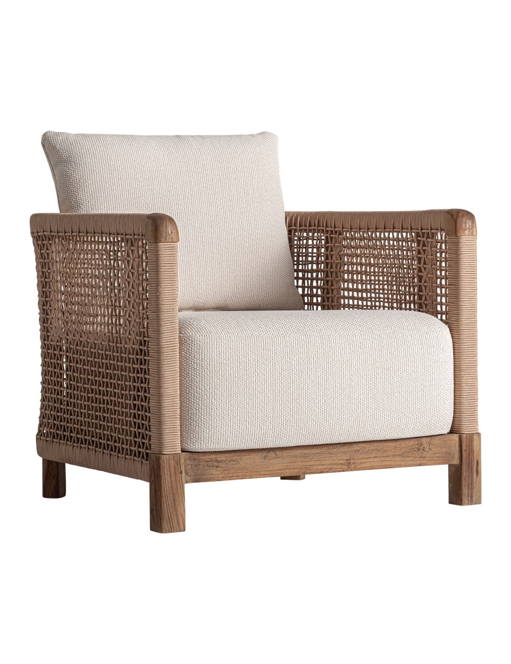 Sillón trena de estilo boho fabricado en madera de teka reciclada en color marrón combinado con polipropileno reciclado en color blanco. Producto desmontable.
